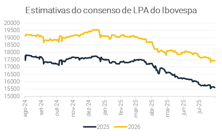 Por fim, as estimativas de LPA para 2025 e 2026 foram revisadas para baixo em -3,25% e -3,31% ao longo da temporada, respectivamente, refletindo a piora no sentimento dos investidores diante do barulho político recente e dos dados de vendas no varejo, que reforçam sinais de desaceleração econômica mais rápida que o esperado.