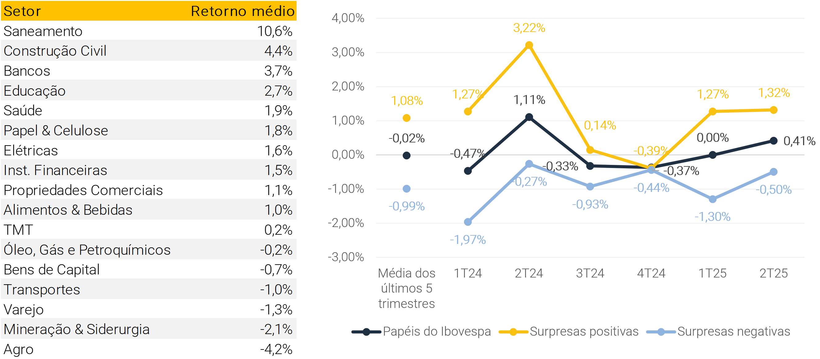 Em resumo, o 2T25 foi marcado por surpresa positiva em lucros, refletida na reação setorial mais enviesada para o positivo, acompanhada de maior volatilidade e movimentos implícitos nas ações.