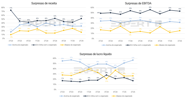Chegamos ao fim da temporada de resultados do 2T25, e dentre as empresas cobertas pela XP, 32% superaram nossas estimativas de receita, 16% ficaram aquém e 52% ficaram em linha das projeções dos nossos analistas. Quanto ao EBITDA (lucros operacionais), 32% superaram nossas expectativas, 53% vieram em linha, e 15% ficaram abaixo. Por fim, olhando para o lucro líquido reportado, 57% superaram nossas estimativas, 17% ficaram em linha e 26% ficaram aquém.