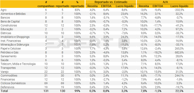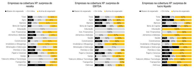 No geral, as empresas da nossa cobertura reportaram receitas 0,3% acima das nossas estimativas, EBITDA 0,8% acima e lucro líquido 3,3% acima. Por setores, os resultados foram majoritariamente positivos em relação às nossas estimativas, com destaque negativo apenas para o setor Financeiro, impactado pelo resultado de Banco do Brasil (BBAS3). Commodities foram o destaque positivo, com surpresa positiva de dois dígitos no lucro líquido.