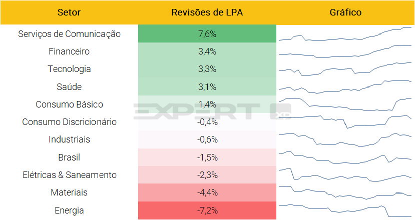 Setorialmente, Telecomunicações e Financeiro tiveram as revisões mais positivas de LPA desde o início da temporada, enquanto Energia e Materiais registraram revisões mais negativas