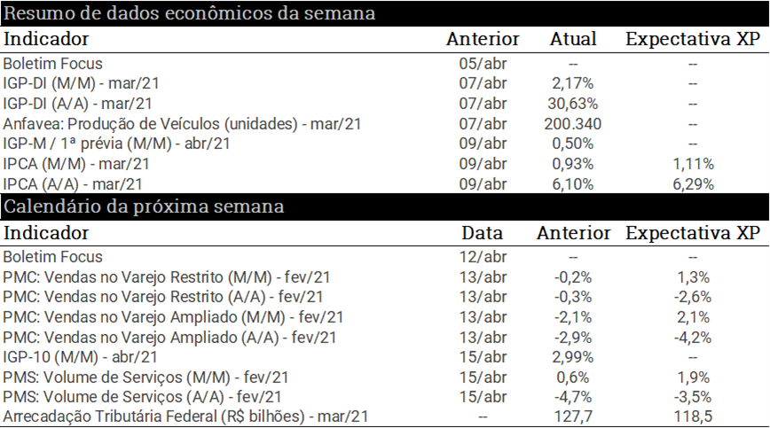 No Brasil, o cenário político-econômico deverá seguir como principal ponto de atenção na semana que vem, com um potencial desfecho para as discussões sobre o Orçamento de 2021. Na seara de indicadores, teremos dados das vendas no varejo e volume de serviços de fevereiro como principais destaques.