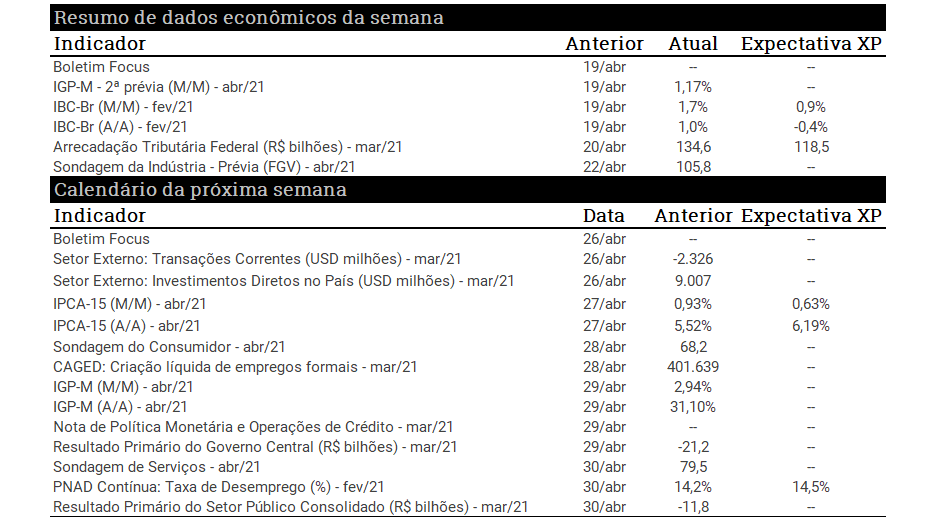 O destaque por aqui foi a resolução do impasse em relação ao Orçamento Público de 2021, com a sanção por vetos parciais pelo presidente Jair Bolsonaro, mantendo o acordo que havia sido firmado com o Congresso. Segundo o time de Política da XP, a decisão foi efetiva para reequilibrar o orçamento, reduzindo o risco de execução para o restante do ano. Além disso, a sanção presidencial abre espaço para a edição de medidas provisórias para retomada de programas emergenciais, como Benefício Emergencial de Manutenção do Emprego e Renda (BEm) e Programa Nacional de Apoio à Microempresas e Empresas de Pequeno Porte (Pronampe).