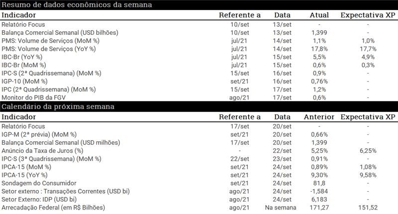 No Brasil, a atenção fica concentrada na reunião do Copom na quarta-feira. O IPCA-15 e a prévia do IGP-M de setembro também serão divulgados. No campo político, esperamos ver a repercussão do anúncio de aumento do IOF tanto na tramitação do Auxílio Brasil (novo Bolsa Família) quanto no TCU, que irá avaliar a medida enquanto solução para a questão fiscal gerada pelo aumento do valor do programa de transferências de renda