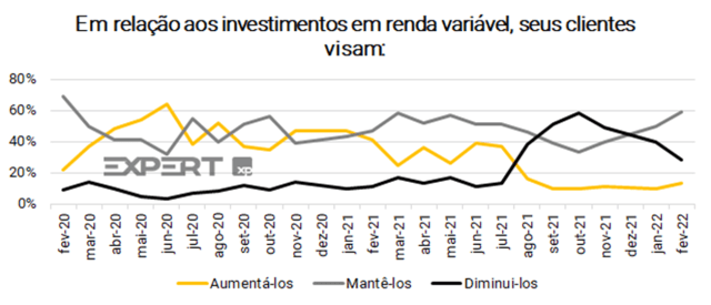 Alocação em Renda Variável continua em baixa, mas o sentimento com a Bolsa brasileira melhorou. Em fevereiro, o percentual dos assessores que disseram que seus clientes visam diminuir a alocação em Renda Variável recuou em -12p.p M/M atingindo um patamar de 28%, menor valor desde julho de 2021. Enquanto isso, os investidores interessados em manter seus investimentos em nessa classe de ativos ficou em 59%, um aumento de +9p.p. M/M, e 13% dos clientes pretendem aumentar seus investimentos na classe de ativos, +3p.p. M/M.