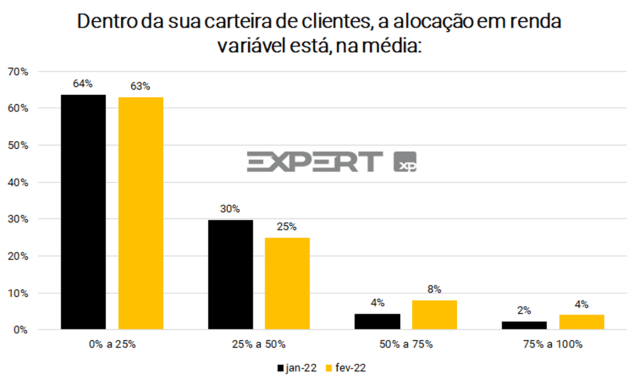 Com os temores fiscais e as elevações nas taxas de juros no Brasil e nos principais mercados do mundo, além do recente aumento de tensões geopolíticas, os investidores continuam sendo mais cautelosos com relação à alocação em Renda Varável. Segundo os assessores, 63% de seus clientes possuem entre 0% e 25% de alocação em Renda Variável ( -1p.p. M/M), 25% possui entre 25% e 50% (-4p.p. M/M), 8% entre 50% e 75% (+3p.p. M/M) e por fim, 4% entre 75% e 100% (+2p.p. M/M).