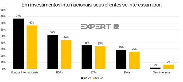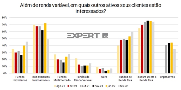 Além de Renda Variável, as classes de ativos que os assessores e seus clientes se mostraram mais interessados foram: 1) Tesouro Direto e Renda Fixa (74%, -1p.p. M/M); 2) Fundos de Renda Fixa (59%, +6p.p. M/M); 3) Investimentos Internacionais (49%, -23p.p. M/M); 4) Criptoativos (35%, -9p.p M/M); 5) Fundos Imobiliários (46%, +6p.p. M/M); 6) Fundos Multimercado (28%, +4p.p. M/M ); 7) Fundos de Renda Variável (15%, +4p.p. M/M); e 8) Ouro (7%, +2p.p. M/M).