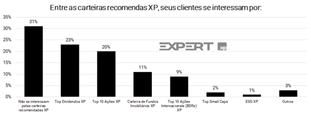 Segundo a pesquisa desse mês, os resultados foram: 1) Não estão interessados pelas carteiras recomendadas XP (31%); 2) Top Dividendos XP (23%); 3) Top 10 Ações XP (20%), 4) Carteira de Fundos Imobiliários XP (11%) e 5) Top 10 Ações Internacionais (BDRs) (9%).