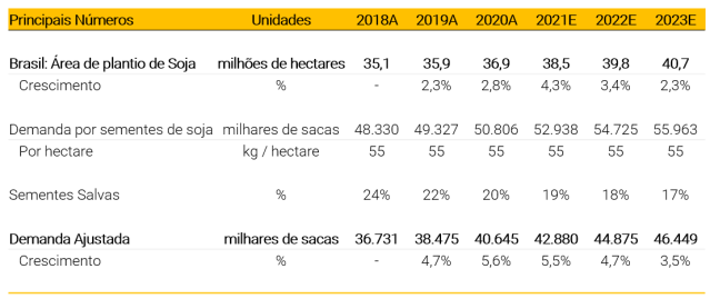 Entendemos que o mercado potencial da Boa Safra para sementes de soja deve continuar a crescer rapidamente, conforme demonstramos na tabela abaixo, apesar da questão das sementes salvas. O crescimento da área de plantio de soja no Brasil, conforme estimativas da CONAB, em conjunto com o aumento dos investimentos em produtividade da lavoura no País devem impulsionar os resultados da SOJA3, na nossa visão.