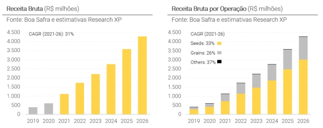 A Boa Safra possui duas fontes relevantes de receita, sendo a primeira e mais importante a venda de sementes, que pode ser estimada pelo valor da tecnologia somada aos royalties em função do volume. A segunda fonte de receita seria proveniente da venda de grãos, uma vez que a soja entra como matéria-prima para a produção de sementes, mas o que não passa no processo de seleção é revendido. Como se trata de uma commodity, ainda que tenha uma relevância na receita total, funciona como detrator de margem, aumentando a receita e EBITDA, mas reduzindo a margem porcentual.