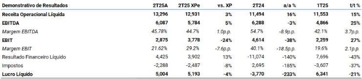 A Suzano reportou resultados neutros, com EBITDA ajustado de R$6,1 bilhões, +5% acima da estimativa da XP e +2% acima do consenso. Com destaque para o forte volume de vendas de celulose e o controle de custos, esperamos que as discussões se concentrem em: (i) potenciais retornos incrementais da troca de ativos biológicos com a Eldorado (que levou ao aumento do guidance de capex para 2025, de R$12,4 bilhões para R$13,3 bilhões); e (ii) a decisão da Suzano de reduzir em 3,5% o volume de produção de celulose de mercado nos próximos 12 meses, reforçando as condições desafiadoras do mercado para os produtores de celulose (embora vejamos com bons olhos a abordagem disciplinada da Suzano nesse sentido). Por fim, observamos um leve aumento na alavancagem no 2T25, para 3,1x dívida líquida/EBITDA versus 3,0x no 1T25 (em dólares), principalmente devido ao ambiente de preços mais fraco para celulose ao longo do 1S25 (preços realizados em torno de US$550/t contra ~US$700/t há um ano). Mantemos nossa recomendação de compra para Suzano.