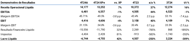 A Suzano reportou resultados em linha, com EBITDA ajustado de R$ 6,5 bilhões, -1% T/T e -1% vs. XPe. Com receita líquida de R$ 14,2 bilhões (+7% XPe), destacamos os volumes de vendas de celulose e papel como o principal destaque sobre os resultados de hoje (+25% T/T e +20% T/T, respectivamente e +5% vs. XPe), com os preços em reais compensando os preços de referência da celulose mais fracos (em USD). Além disso, o custo caixa por tonelada diminuiu 6% T/T (excluindo tempo de inatividade), refletindo menores custos de madeira, menor consumo de insumos e maior diluição dos custos fixos (principalmente lastreados no Cerrado). A empresa também concluiu a aquisição dos ativos da Pactiv no 4T24, com a recuperação industrial ocorrendo conforme planejado. Por fim, considerando nossa perspectiva positiva para os preços da celulose e a significativa melhora na geração de fluxo de caixa após o ramp-up do Cerrado, reiteramos nossa visão positiva para a Suzano.