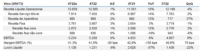 A Vivo reportou resultados neutros e em linha com nossas estimativas no 4T22. A empresa reportou um sólido crescimento de receita (+10% A/A), com receitas de FTTH e serviços móveis crescendo +19% e +14%, respectivamente. No entanto, a margem EBITDA caiu -1,5pp A/A, devido a despesas operacionais acima do esperado. Por fim, a Vivo reportou lucro líquido de R$ 1,1 bilhão, -57% inferior ao ano anterior e -9% inferior ao nosso, devido às maiores despesas financeiras no trimestre. Além disso, a Vivo anunciou: (i) que protocolou pedido de anuência prévia à Anatel para permitir a redução de capital no valor de até R$ 5 bilhões; (ii) R$ 5,7 bilhões de remuneração ao acionista em 2022 (Dividend Yield de 8,9%) + R$ 932 milhões de dividendos/JCP anunciados hoje; e (iii) guidance de CAPEX para 2023 de até R$ 9,0 bilhões. Com isso, mantemos nossa recomendação Neutra e preço-alvo de R$49,0/ação para o fim de 2022.