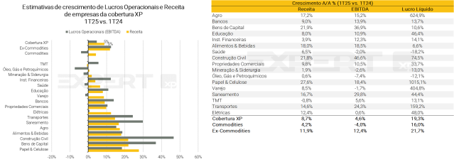 Olhando para toda cobertura XP, que incluem ~150 empresas, as expectativas também são positivas. Com base em estimativas prévias dos analistas até o momento, é esperado um crescimento nos resultados para quase todos os setores. Os números consolidados indicam um crescimento de 9% em receita e 5% de EBITDA comparado com o 1º trimestre de 2024.