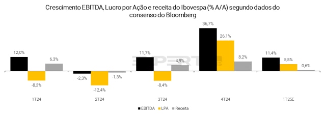 Em comparação com o 1° tri de 2024, o consenso do mercado, segundo dados do Bloomberg, espera um crescimento do LPA (lucro por ação) de 5,8%. Para o EBITDA (lucros operacionais) e receita, as expectativas são de crescimento de 11,4% e 0,6%, respectivamente. Esse crescimento mais fraco reflete um cenário macroeconômico doméstico ainda pressionado, além de uma valorização do real prejudicando as exportadoras. Em 2025, nós esperamos que o cenário macroeconômico doméstico se deteriore ainda mais, com a taxa Selic atingindo 15,5%, além de uma desaceleração da atividade econômica.