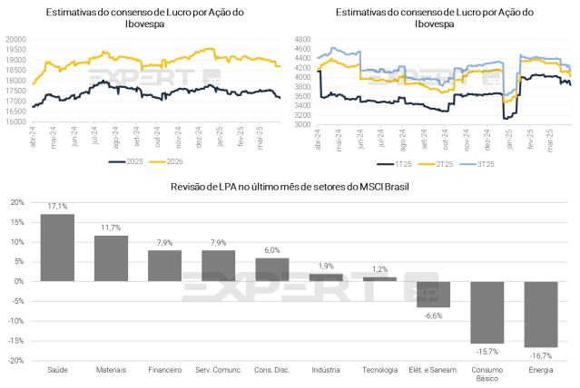 Desde o início de janeiro, as estimativas de Lucro por Ação (LPA) foram revisadas para baixo em 3,1% para 2025, enquanto as estimativas para 2026 caíram 4,3%. Olhando para estimativas trimestrais, as projeções para o 1T25 foram revisadas para cima, em 4,7% durante o mesmo período, enquanto as estimativas para o 2T25 e o 3T25 foram revisadas para baixo em 3,1% e 4,1%, respectivamente. Em relação aos setores, quase todos tiveram revisões positivas no último mês, com o setor de Saúde apresentando sendo o destaque positivo (+17,1%). Enquanto isso, o setor de Energia foi o que apresentou a revisão mais negativa, em -16,7%. Notavelmente, Elétricas & Saneamento apresentou revisão negativa de 6,6% – de acordo com o nosso último relatório de Posicionamento dos Fundos de Ações, esse é o setor com o posicionamento mais concentrado dos fundos de ações e, no último mês, esse posicionamento aumentou ainda mais, em 4,34 p.p M/M.