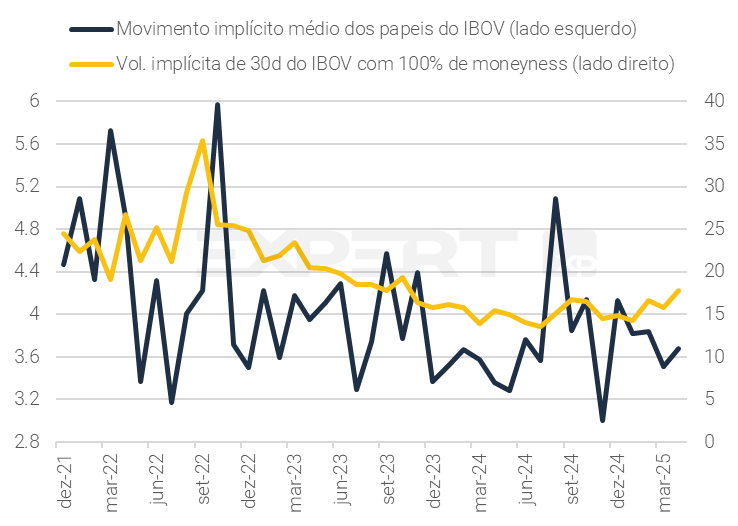O mercado ainda espera uma dispersão moderada nos resultados, mas essa divergência entre o movimento implícito estável por ação e o forte aumento na volatilidade implícita do índice indica que, embora o mercado ainda não esteja precificando uma diferenciação significativa entre os resultados individuais, já começa a incorporar um risco mais amplo e sistêmico.