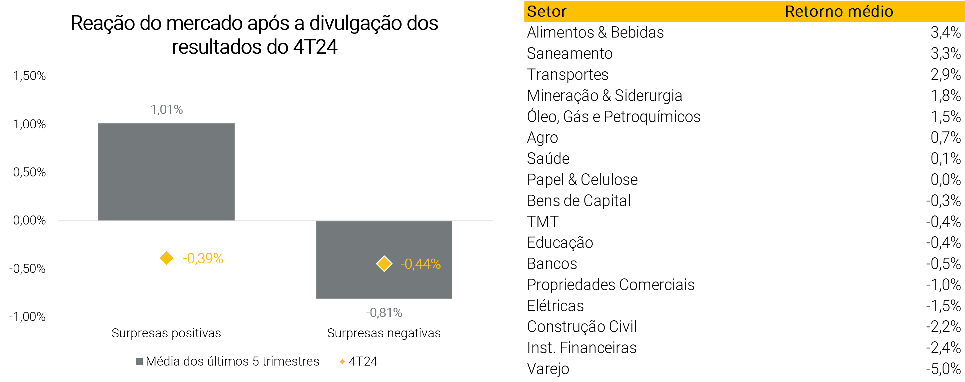 A última temporada de resultados desapontou, com reação geral negativa do mercado após os resultados das empresas do Ibovespa (-0,37%, considerando uma média simples). Em comparação com a média de reação do mercado nos últimos 5 trimestres, observamos duas principais divergências: 1) uma reação uniforme em magnitude e direção, independentemente do resultado ter sido positivo ou negativo em relação às estimativas; e 2) no último trimestre, as reações diferem significativamente: surpresas positivas no 4T24 resultaram, em média, em uma queda de -0,39% (vs. média de +1,01%), devido a guidances piores que o esperado, enquanto surpresas negativas resultaram em uma queda de apenas -0,44% (vs. média de -0,81%).