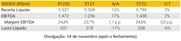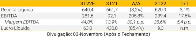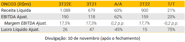 Esperamos que a Oncoclínicas apresente resultados sólidos no 3T22, com a frente orgânica e inorgânica impulsionando a receita, especialmente considerando que a Unity pode contribuir com todos os 3 meses de receita relativos ao 3T22 (aproximadamente R$150M). Acreditamos que a empresa deve continuar a entregar melhorias de margem bruta (+2,1 p.p. A/A) à medida que continue ganhando eficiências de custos ao integrar as empresas adquiridas. Esperamos que a margem bruta caia 1,4 p.p. T/T, uma vez que os cancer centers devem perder representatividade dentro da receita total. Estimamos que a margem EBITDA ajustada permaneça estável tanto A/A quanto T/T, uma vez que o processo de integração da Unity ainda está em andamento. Por fim, o alto endividamento e as ineficiências fiscais ainda devem impactar negativamente o lucro líquido ajustado, o qual estimamos em R$26M no trimestre.