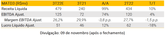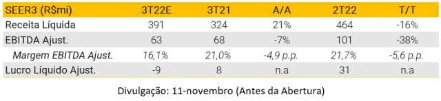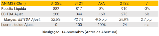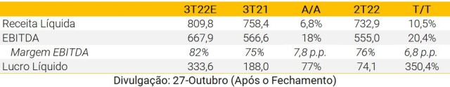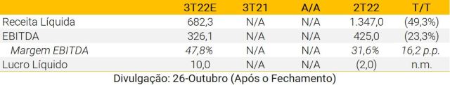 Após vários trimestres negativos, esperamos que a Brisanet apresente resultados sólidos no 3T22. Números operacionais já foram divulgados, com ligeira aceleração para 22k/mês de adições líquidas em agosto. Projetamos vendas líquidas de R$ 255 milhões (+34% A/A). Com relação à lucratividade, esperamos que a empresa apresente uma expansão de margem EBITDA de 6,5 pp A/A, atingindo 44,7%, refletindo diferentes iniciativas de custos iniciadas no 2T, além de maior alavancagem operacional à medida que a empresa expande sua ocupação de rede em novas cidades. Por fim, esperamos um lucro líquido de R$ 10 milhões.