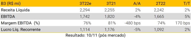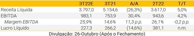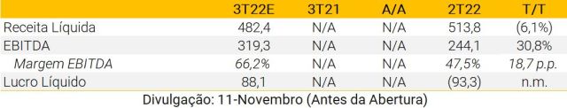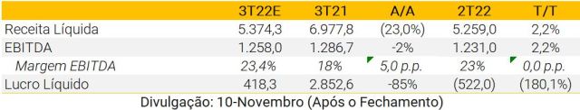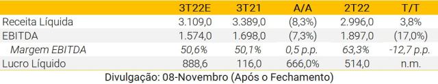 Esperamos que a CCR publique resultados neutros do 3T22. O tráfego relatado de -2,2% A/A reflete o (i) fim de duas concessões (RodoNorte e NovaDutra), e (ii) início das tarifas de pedágio da RioSP. Em uma base comparável, o tráfego rodoviário de pedágio cresceu 6,5% A/A (vs. +4,3% A/A para Ecorodovias). Prevemos resultados recorrentes de: (i) receita líquida de R$ 3,5 bilhões (+15% A/A); (ii) EBITDA de R$2,0 bilhões (+18% A/A); e (iii) lucro líquido de R$486 milhões (2,6x A/A).