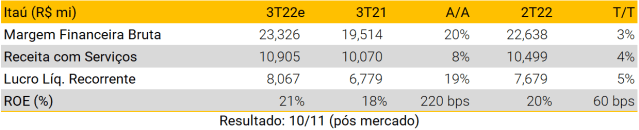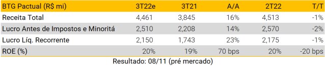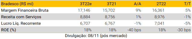 Vemos um trimestre positivo para os bancos incumbentes no 3T22, impulsionado principalmente por: i) crescimento robusto do crédito; ii) ligeiro aumento da inadimplência; iii) expansão das receitas de tarifas; e iv) menor consumo de índice de cobertura. Do lado negativo, o segmento de mercado de capitais continua pressionado por volumes de negociação mais baixos e atividade de ECM mais suave. Dito isso, esperamos que a margem financeira bruta continue expandindo, em grande parte devido ao ritmo robusto de concessão de crédito e à elevação das taxas de juros. As receitas de tarifas devem continuar se beneficiando da retomada gradual da atividade econômica, com destaque para a retomada no segmento de adquirência. Por fim, esperamos que o principal ponto de atenção sejam os índices de inadimplência, principalmente para pessoas físicas, em meio ao atual ambiente macro desafiador.