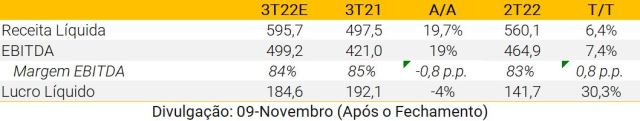 Esperamos que a Unifique apresente resultados mistos no 3T22, com crescimento de receita líquida de +56% A/A, impulsionado principalmente pelo crescimento inorgânico. Destacamos o crescimento orgânico ainda em ritmo inferior ao esperado. Em relação à lucratividade, esperamos que a empresa entregue 10bps de expansão da margem EBITDA A/A (plano QoQ), atingindo 51,5%, devido à alavancagem da operação. Por fim, esperamos um lucro líquido de R$ 44 milhões.