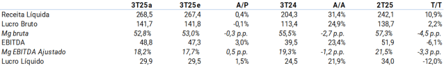 A Track & Field reportou um terceiro trimestre sólido e dentro do esperado, com forte crescimento da receita, mas níveis de rentabilidade pressionados pelo mix de canais. A TFCO apresentou um dos crescimentos de receita mais expressivos entre as empresas que acompanhamos, impulsionado pela assertividade das coleções, público premium e alto posicionamento em presenteáveis. No entanto, a empresa apresentou forte compressão de margem devido ao maior volume de vendas de mercadorias para franqueados (sell-in), embora isso tenha sido parcialmente compensado pela alavancagem operacional. De forma positiva, é importante lembrar que isso deve se traduzir em uma maior participação de royalties no quarto trimestre, o que, por sua vez, é um fator positivo para as margens. Apesar de recebermos mais um conjunto de resultados fortes, mantemos nossa recomendação Neutra devido ao valuation justo, com múltiplos de 17-13,5x P/L para 2025-26e, e liquidez limitada.