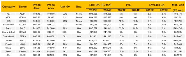 Pelo lado positivo, (i) outro trimestre forte para a Vamos (XPe EBITDA +86% A/A), com forte atividade comercial e aumento do yield marginal; (ii) forte atividade de compra de carros da Localiza (consolidando seu posicionamento de mercado vantajoso); e (iii) continuidade do forte desempenho da margem da JSL, apesar do cenário desafiador de custos (margem EBITDA +2,2 p.p. A/A). Do lado negativo, notamos: (i) fraqueza nos volumes da Santos Brasil fazendo com que o EBITDA caísse 22% no trimestre e ficasse 13% abaixo do consenso (indicando potencial de queda para o consenso de 2023); (ii) pressão nos resultados da Movida com a depreciação continuando a subir e as margens dos Seminovos caindo (lucro líquido XPe R$ 32 milhões, vs. R$ 94 milhões no 3T22); e (iii) resultados abaixo do esperado para a Rumo, apesar do contínuo bom momento operacional e nossa visão otimista para 2023 (XPe EBITDA R$ 896 milhões está 14% abaixo do consenso).