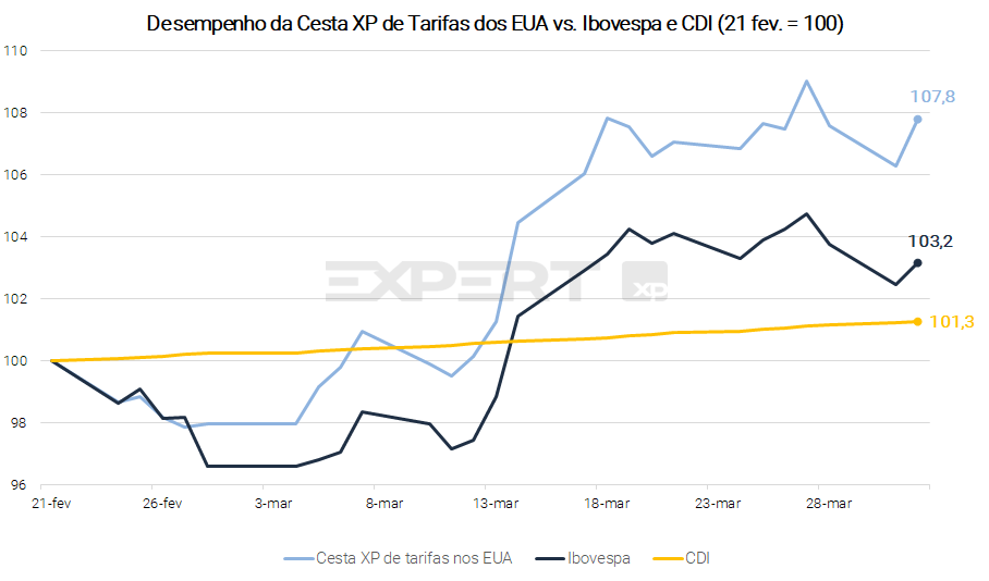 Nesta semana, o presidente dos EUA, Donald Trump, anunciou uma série de “tarifas recíprocas” contra diversos países, incluindo uma tarifa base de 10% contra o Brasil, o que gerou uma forte reação negativa nos mercados globais. Um dia após o anúncio, o S&P 500 caiu 4,9% e o Nasdaq recuou 6,0%. Em um cenário tão desafiador, saber como se posicionar faz toda a diferença — e nossa Cesta de Tarifas XP, composta por ações que tendem a se beneficiar de um ambiente de tarifas maiores, já acumula alta de 7,8%, contra 3,2% do Ibovespa desde a sua criação.