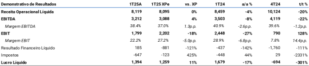 A Vale reportou resultados neutros no 1T25, com EBITDA proforma ajustado de US$ 3,2 bilhões, +4% vs. XPe e +1% vs. consenso. Com os números operacionais já reportados (clique aqui), observamos: (i) um desempenho melhor na divisão de transição energética da Vale, refletindo maiores preços realizados e receitas de subprodutos na divisão de Cobre e recuperando resultados na divisão de Níquel; e (ii) um sólido desempenho de custos em Soluções de Minério de Ferro da Vale, com C1/t em US$ 21,0/t (-4% vs. XPe, -11% A/A e +12% T/T), com a empresa reiterando seu guidance para C1 de US$ 20,5-22,0/t para 2025E (com custos de produção C1 de US$ 23,1/t no 1T25, -7% A/A)). Em suma, reiteramos nossa recomendação Neutra para Vale com um upside limitado, embora vejamos uma assimetria positiva nos preços atuais da VALE3.