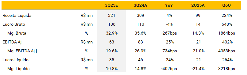 Esperamos que a Vittia reporte um 3T25 fraco, refletindo o cenário estressado para os agricultores, ainda impactando negativamente a adoção de tecnologia. Apesar de um aumento modesto de +4% A/A na receita, o mix de vendas foi desfavorável, com crescimento em fertilizantes de solo (margens menores) e queda em fertilizantes foliares e produtos industriais (margens maiores). Isso deve levar a um lucro bruto de BRL 106Mn (-4% A/A) e uma queda de -267bps na margem bruta para 32,9%. Reduções adicionais de custos não devem ser significativas no 3T, resultando em EBITDA ajustado de BRL 63Mn (-25% A/A) e margem de 19,6% (-734bps). No resultado líquido, esperamos um lucro de BRL 35Mn (-24% A/A) e margem de 10,8% (-402bps). Não vemos gatilhos relevantes para a ação no curto prazo.