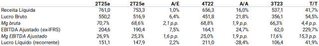 A Vivara reportou resultados sólidos no 2º trimestre, com forte dinâmica de receita (conforme esperado) e superação da margem bruta, embora parcialmente compensada por maiores despesas administrativas (SG&A).