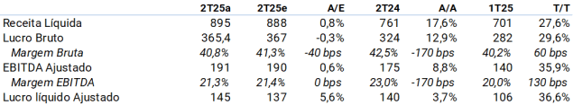 Interessante notar que: i) O programa de dividendos mensais foi estendido até dezembro de 2025 (a R$ 0,125/mês, yield de 9%), com um pagamento extraordinário de R$ 300 milhões anunciado (yield de 5,6%); ii) A gestão está otimista com as perspectivas para o 2S25, com carteira de pedidos robusta, aceleração do sellout no varejo e investimentos eficientes para atender à demanda crescente; e iii) A Under Armour apresentou seu melhor trimestre sob a gestão da Vulcabras, enquanto a Olympikus continua crescendo em todos os canais, principalmente pela alta demanda da linha Corre, e a Mizuno reforçou sua presença no segmento performance-training.