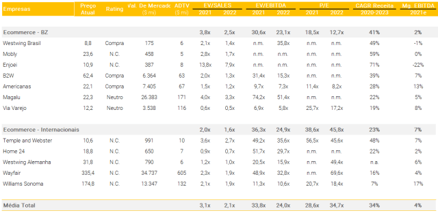 Competição. É difícil não abordar a concorrência ao discutir o comércio eletrônico. E aqui não é diferente, pois estamos vendo tanto players de nicho (como Mobly, MadeiraMadeira e Tok Stok) e marketplaces generalistas (como MELI, Magalu e B2W) operando neste segmento. No entanto, vemos casa e decoração como uma das categorias que exigem um nicho de mercado, principalmente quando se concentra mais em decoração, enquanto a Westwing tem um modelo de negócios muito diferente (através das campanhas do Club) e também de posicionamento, focando muito mais na decoração e categorias de estilo de vida, que exigem maior curadoria. Como resultado, não vemos um concorrente direto no online, enquanto vemos apenas a Camicado como um concorrente potencial no varejo físico, mas com um sortimento menor.