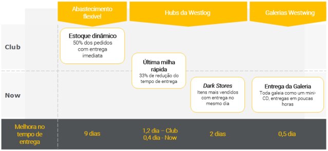 As principais iniciativas da empresa nessa frente são: (i) investir na expansão de seu Centro de Distribuição (localizado em Jundiaí – SP), (ii) construir hubs da Westlog (braço logístico da empresa) para apoiar a capilaridade em outras regiões e (iii) expandir a frota própria da Westlog.