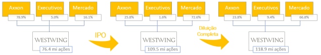 Estrutura acionária da companhia pré-IPO, pós-IPO e com diluição completa considerando o plano de opções de ações