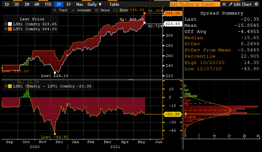 Durante a sessão de sexta-feira, 28 de maio, a diferença entre os contratos BGIM21 e BGIV21 marcou a diferença de 14,70, acionando a parcial e ajuste de stop da operação de 24,25 para 22,50.
