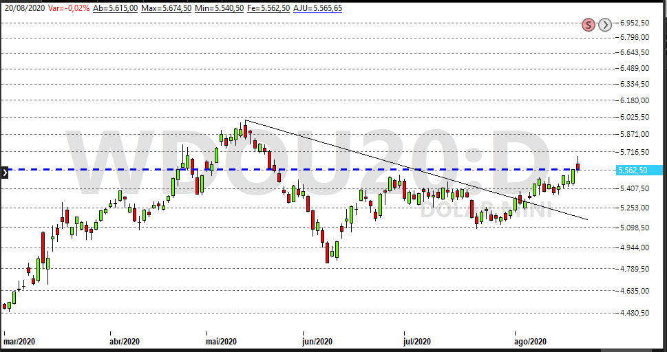 O Dólar futuro está em tendência de alta e acima dos 5.520 projeta teste dos 5.750 ou 6.000. Tem suportes em 5.353 e 5.238.