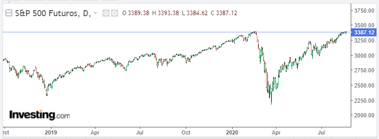 S&P 500 futuro está em canal de alta e segue testando topo histórico. Acima dos 3.400 projetaria de 3.600 a 3.870. Tem suportes em 3.325 e 2.935 no fundo de junho.
