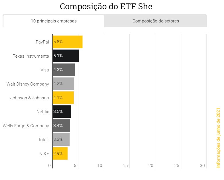 O investimento é feito através do ETF She e cada empresa tem no máximo cerca de 5% de peso na composição.