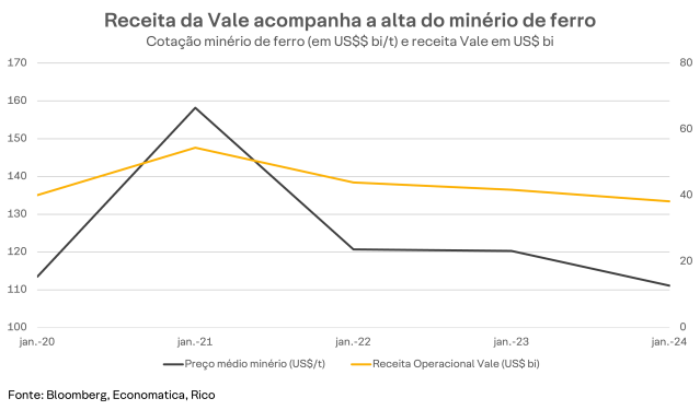 O gráfico abaixo ilustra como a receita operacional da Vale acompanhou as variações no preço médio do minério de ferro, evidenciando a relação direta entre esses fatores e o desempenho financeiro da companhia.