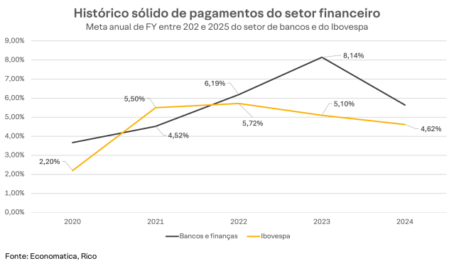 Além do volume expressivo de dividendos pagos, o setor financeiro também se destacou pela consistência no retorno percentual aos acionistas. Entre 2020 e 2024, a média anual de dividend yield (DY) dos bancos superou a do Ibovespa em todos os anos, refletindo o perfil mais previsível e orientado à geração de caixa dessas instituições.