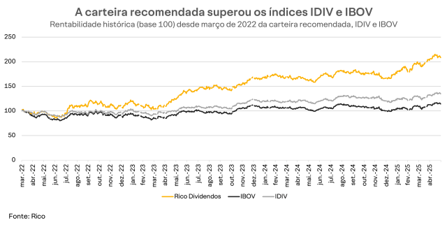 Para ilustrar essa ideia, vamos fazer a comparação entre o histórico de resultado da nossa carteira recomendada de dividendos, o índice IDIV — referência para empresas pagadoras de dividendos e o Ibovespa – principal índice de ações da B3. A nossa carteira focada em dividendos têm apresentado desempenho consistentemente superior ao Ibovespa, desde março de 2022. Esse resultado reforça o papel estratégico de uma seleção qualificada de ações para potencializar os rendimentos do investidor.