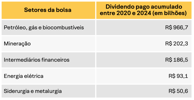 O setor de petróleo e gás foi o grande destaque, acumulando quase R$ 1 trilhão em proventos, impulsionado pelos resultados extraordinários da Petrobras ao longo do período. Em segundo lugar, aparece o setor de mineração, liderado pela Vale, seguido pelos bancos, pelas empresas de energia elétrica e pelas siderúrgicas.