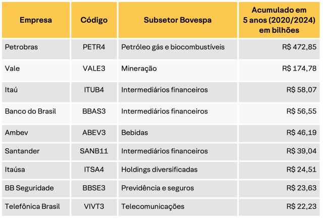 As características dos setores mais resilientes — como forte geração de caixa, margens consolidadas e menor necessidade de reinvestimento intensivo — ajudam a identificar um padrão também no nível microeconômico. Entre as empresas listadas na bolsa, aquelas que mais distribuíram dividendos nos últimos cinco anos pertencem, em sua maioria, a segmentos com receitas estáveis e alto poder de precificação.