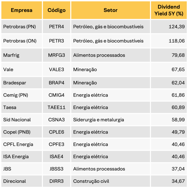 Por outro lado, ao analisar o dividend yield médio dos últimos cinco anos — que representa o percentual anual recebido em dividendos em relação ao preço da ação — surgem outros nomes de destaque. Embora menos evidentes à primeira vista, essas empresas apresentaram desempenho positivo no quesito geração de renda, reforçando sua relevância para investidores focados em retorno consistente.