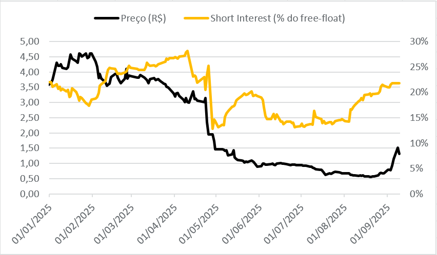 - forte depreciação dos preços, o que pode elevar as posições vendidas no papel ao longo do tempo (em caso de queda prolongada, esses mesmos investidores operando vendido podem se ver obrigados a encerrar suas posições, fazendo com que o ativo suba repentinamente);