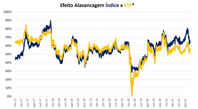 *Resultados hipotéticos teóricos de estruturas de 5 anos levando em conta a participação teórica do ETF e do Índice em uma estrutura de capital protegido. Data base de cálculos: 6 de outubro de 2021.