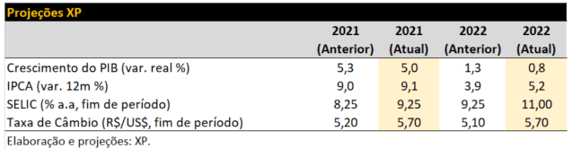 Dessa forma, a nossa equipe de Macroeconomia, liderada por Caio Megale, revisou as projeções para o Brasil em 2021 e 2022. Segundo eles, a regra constitucional do teto de gastos, principal norte de controle das despesas públicas, terá menor efetividade daqui para frente. Diante disso, a percepção de risco dos agentes de mercado subiu consideravelmente nos últimos dias, pressionando ativos financeiros e deteriorando as perspectivas da economia.
